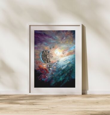 Explore Our Star Wars Art Collection: This unique art selection makes the perfect gift for enthusiasts, featuring iconic characters and scenes like the imposing Darth Vader, the mysterious Mandalorian in his Beskar armor, the swift Millennium Falcon zipping through the galaxy, the formidable Star Destroyer looming in space, the sun-drenched landscapes of Tatooine, agile X-Wing Starfighters in mid-battle, and the menacing TIE Fighters. Dive into the rich universe of Star Wars with these detailed and vibrant artworks.